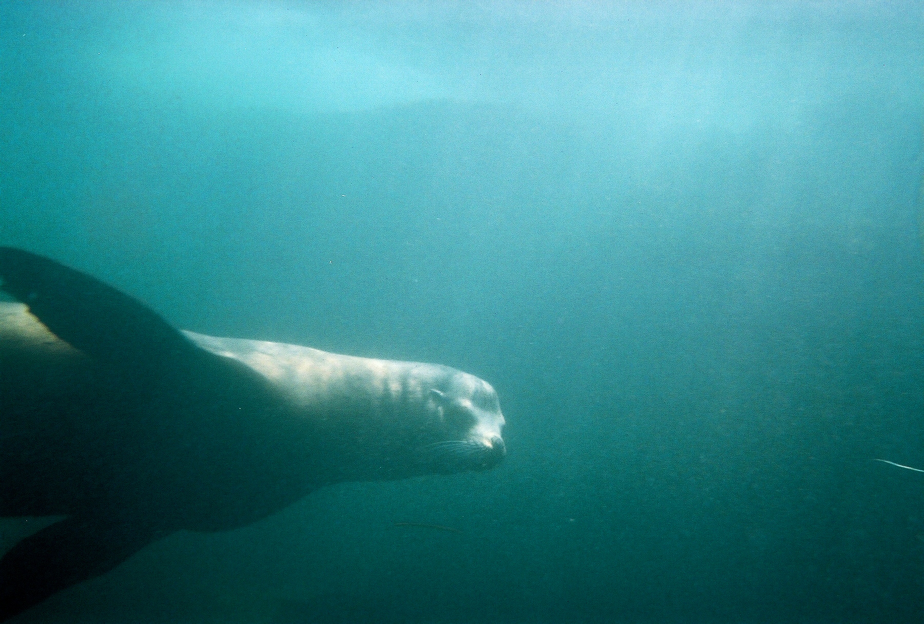 Whatever. So I hop in, swim about and over near the sea caves I see this blur shoot past me and, being a year since I was last in the water, got a bit startled. Turned around to find two sea lions frolicking nearby. So I swim on over to let them know that kind of cheek won’t stand. I swim up to one and she darts off, so I follow her a little ways, and she dives down to the bottom, about thirty feet below. So I follow her down and she does this little twirl, so I twirl around too. I think this caught her by surprise because she stopped swimming away and gave me this wide-eyed “the hell did you just do?” sort of look. I needed air by that point, so I swam back up and she followed me this time, about eight feet away.