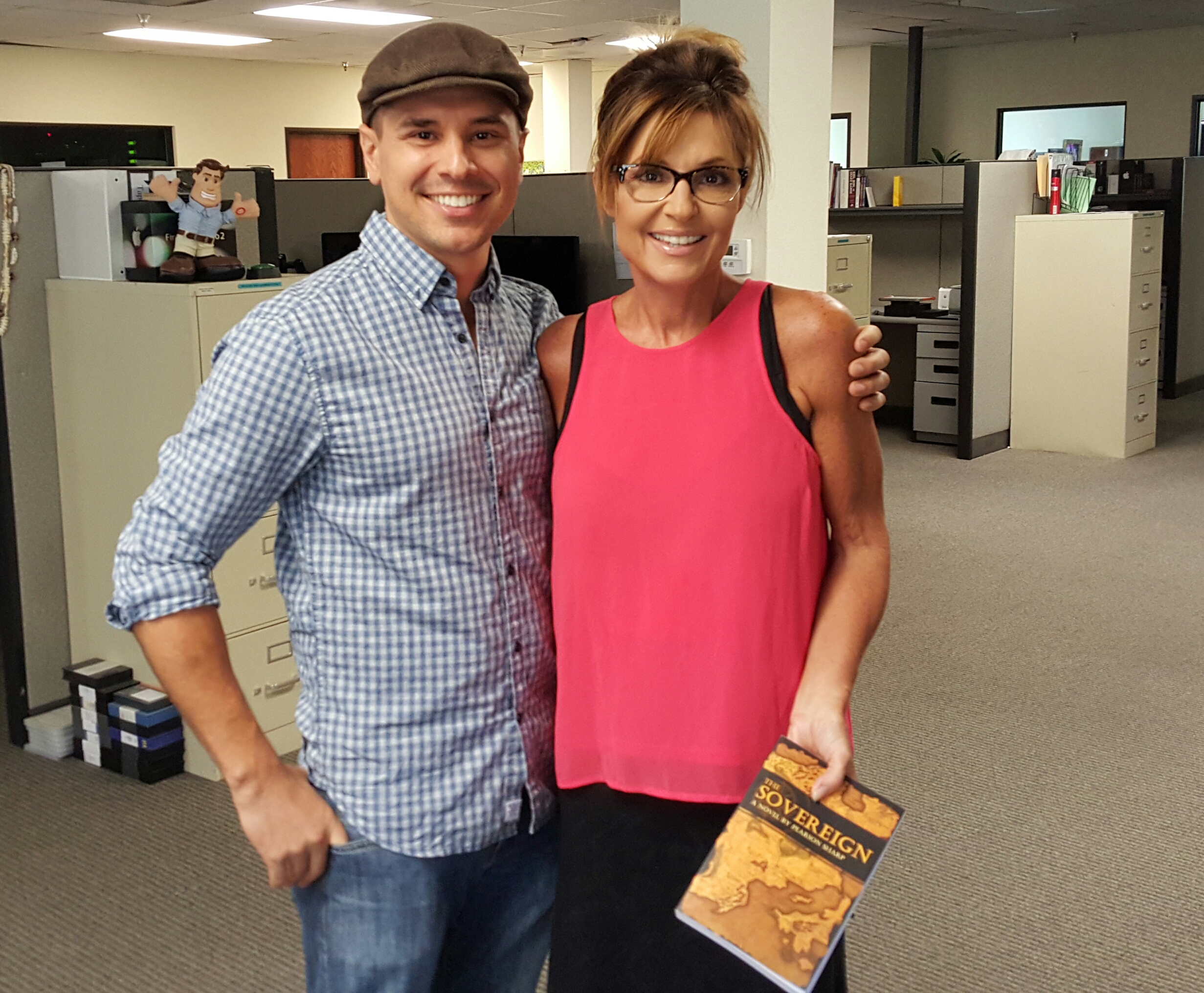 In any case, Sarah Palin came by the office! She was in town and came by to visit the station, and I was introduced to her by the station owner. He told her I was writing a book and she asked about it. I explained The Sovereign as briefly and simply as I could, giving my best elevator pitch while trying to reconcile the fact that I was talking to a national figure. She seemed interested, and offered to take a picture with me to help me out and promote my book.