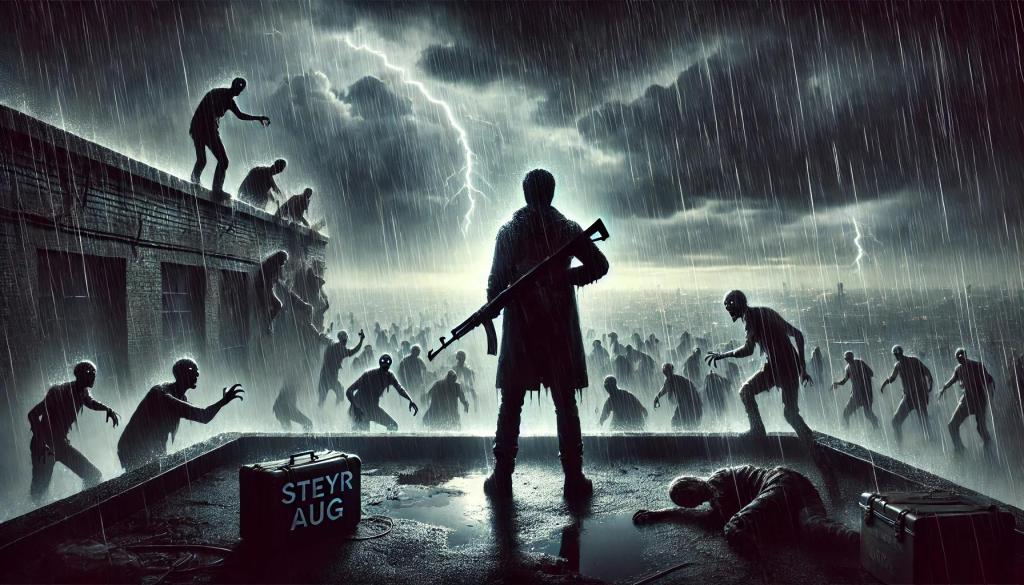 So it became every man for himself; I eventually got a hold of a Steyr Aug (which is totally sweet), but only two magazines of ammo. I was taking zombies out, but they were huge and each one needed like fifteen rounds to kill. So finally I climb up on the roof, and it’s storming and the wind is blowing and there’s a turbulent sky above, and the zombies all follow me to the rooftop and I can see them climbing over the top and coming towards me. I’m like, damn, this sucks.